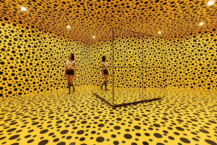 無限の反復と感覚的経験の領域に踏み込む草間氏の作品は、ドット、目、網、かぼちゃなどの繰り返しのモチーフで特徴付けられる魅惑的なインスタレーション、彫刻、絵画で広く知られています。この没入型インスタレーションは、草間氏のシグネチャースタイルを披露し、鮮やかな色彩、鏡、緻密に作られたかぼちゃの彫刻を通して来館者の心を捉える旅に誘います。