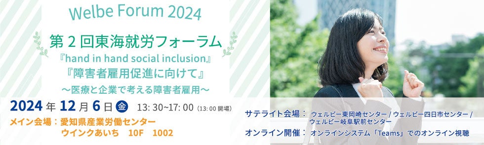 ウェルビー株式会社 (本社:東京都中央区、代表取締役社長:大田誠、以下当社)は、愛知県・三重県・岐阜県エリアにおいて障害者雇用をテーマにした『就労フォーラム』を開催いたします。