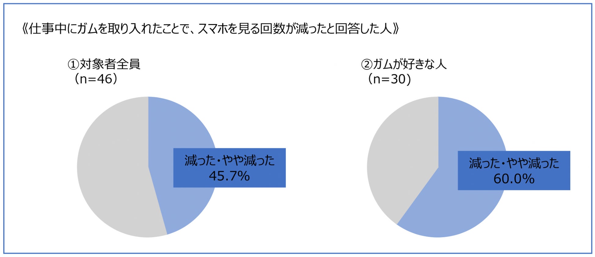 仕事や勉強に集中するためにガムを噛むという方がいらっしゃいます。実は、ガムを噛むことによる集中力向上は研究データでも示されています。デスクワークや作業中の集中力を高めることで、スマホの誘惑を断ち切り、目的もないのになんとなく気になって触ってしまうスマホ時間を減らすことができると考えています。仕事中にガムを取り入れていただいたところ、45.7%の方が仕事中についついスマホをさわってしまう回数が減ったと回答しています。ガムがもともと好きだったという方に限定すれば60.0%の人が、スマホをさわる回数が減ったと回答しています(*1)(下記グラフ参照)。