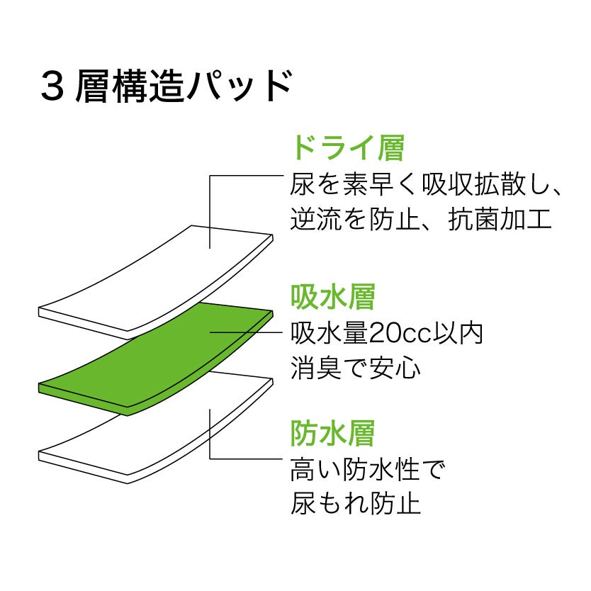 そこで、3層構造のパッドのドライ層には抗菌加工を施し、汚れの目立たないブラックの生地を使用、清潔感を向上させています。また前立て部分の不要なボタンを外すことで排尿をスムーズに。大きいサイズの需要が高いことも分かり、サイズ展開に3Lサイズを追加しました。