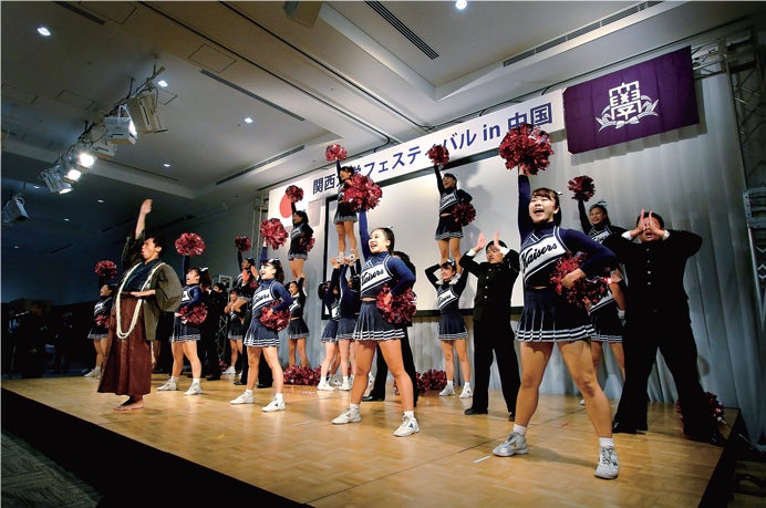 第2部では、本学卒業生による司会のもと、立食形式での交流会を実施。関西大学応援団による演舞演奏や越中八尾おわら風の盆の実演など、本学と北陸の良さを感じることができます。