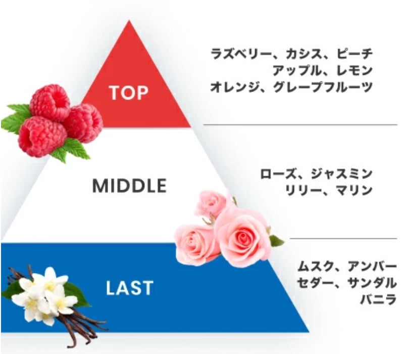 スッキリとしたフルーティな香りから、上品なフローラルブーケ、バニラの甘い香りへと変化していきます。