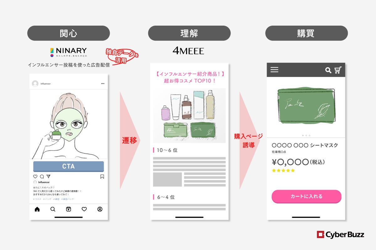 - ①インフルエンサータイアップと独自のオーディエンスデータを活用した高効率なレコメンド配信