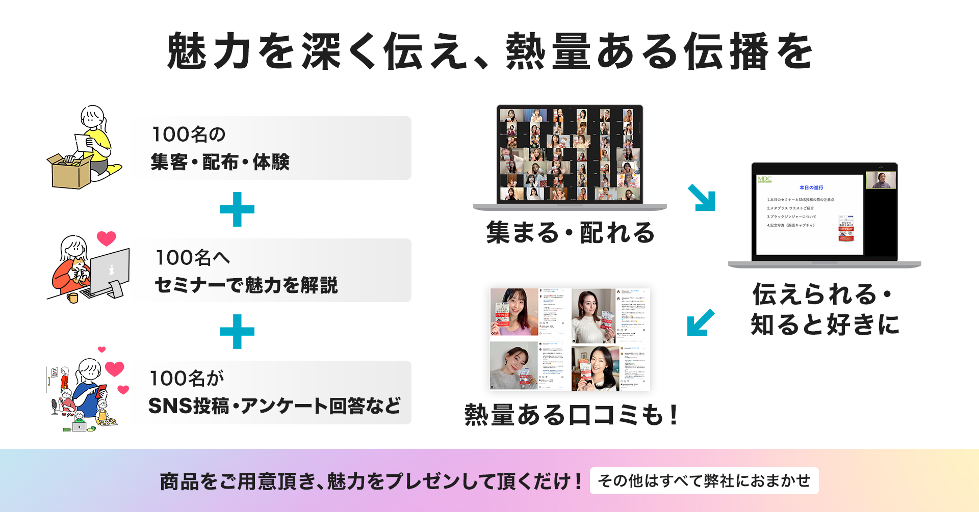 特に商品サンプリング領域では、多くの女性ユーザーと様々な商品をお繋ぎし、女性ユーザーに商品の良さを体感して頂いた上で、魅力を広める口コミを発信していただいてきました。さらに、その実際の声を活用し商品開発から販促活動まで幅広いサポートもさせていただいております。