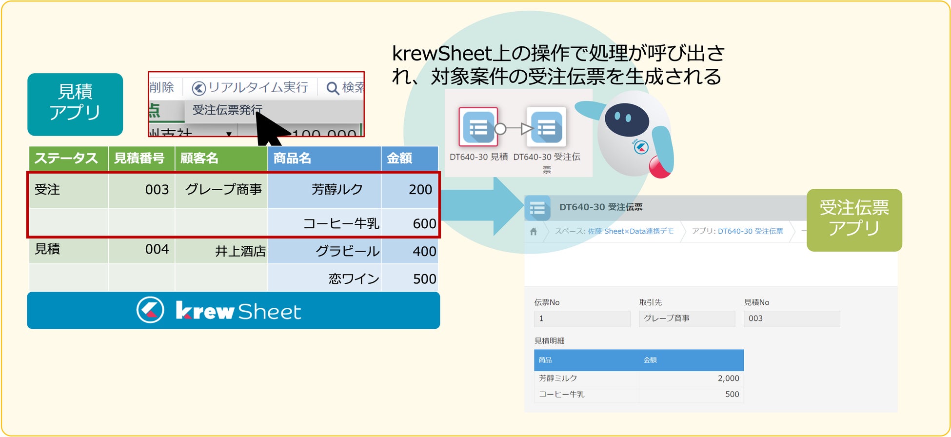例えば、krewSheetで作成した営業案件の見積り画面上で受注伝票を発行したり、売上実績アプリから各拠点の実績を即時集計し、拠点ごとの予算に対する状況を確認したりするといったことが可能です。