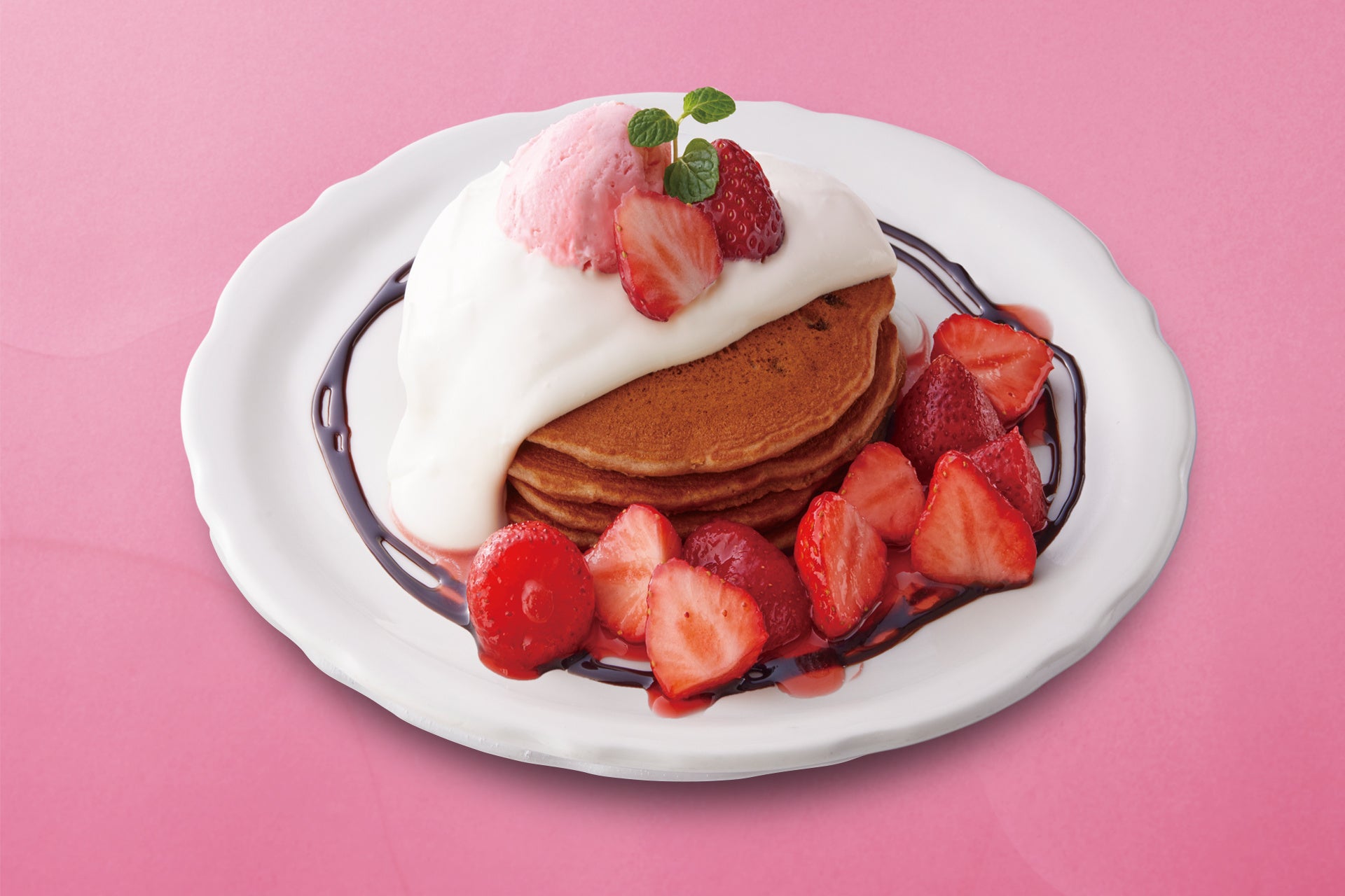 コクのあるチョコレートパンケーキ生地に、口あたりの良いホワイトチョコレートクリームをトッッピング。フレッシュストロベリーをたっぷり使った特製ソースの甘酸っぱさとのコントラストをお楽しみください。