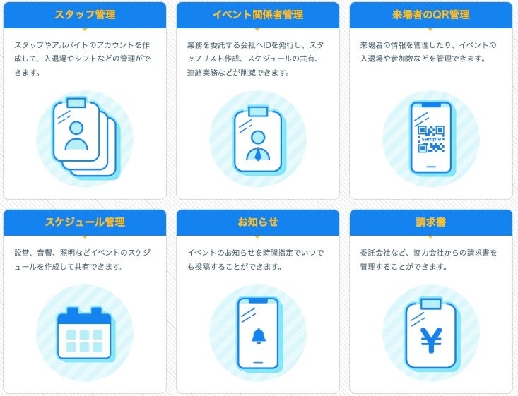 EVENT GOODではイベント管理システムも充実しております。 スタッフシフト管理では、各スタッフが個人のスマホでシフトを確認できるようになります。 全ての機能がリアルタイムに更新が可能なので急な変更があった場合もスタッフらは、スマホで確認してイベントの運営にあたることができます。その他にもイベント運営にあたり必要なサービスを取り揃えておりますので、詳しくはHPをご確認下さい。URL:https://eventgood.jp/lp-top-host