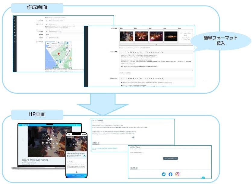 フォーマット入力の簡単操作で、誰でも簡単にイベント専用の作成が可能です。 必要情報を入力するだけでプロ並みのHPがあっという間に完成します。イベントに最適化されたフォーマットには重要なアクセス情報やSNSの連携も簡単に追加できます。