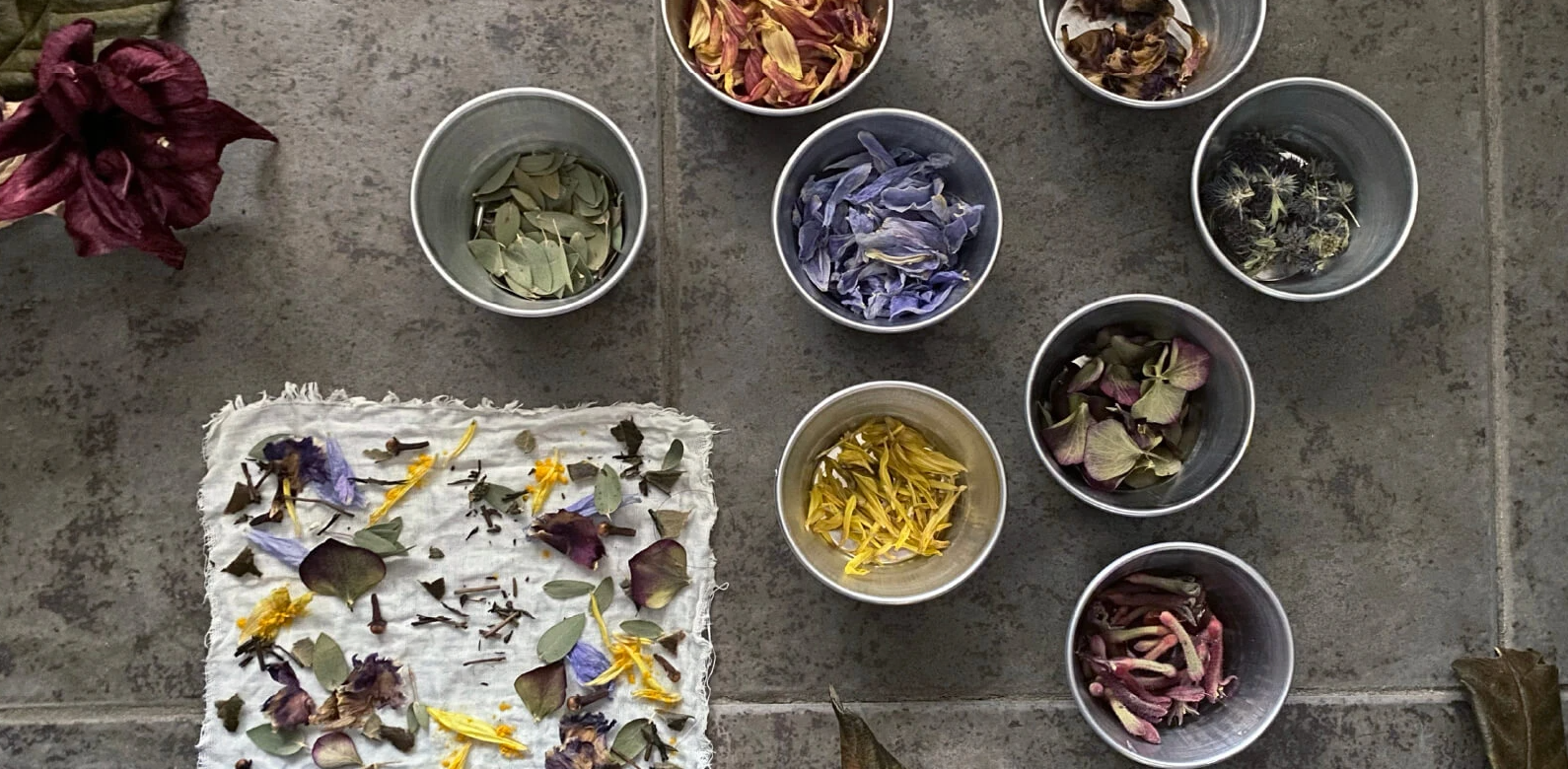 【抗菌ガーゼのハンカチを、ドライフラワーで染め付けるワークショップ】