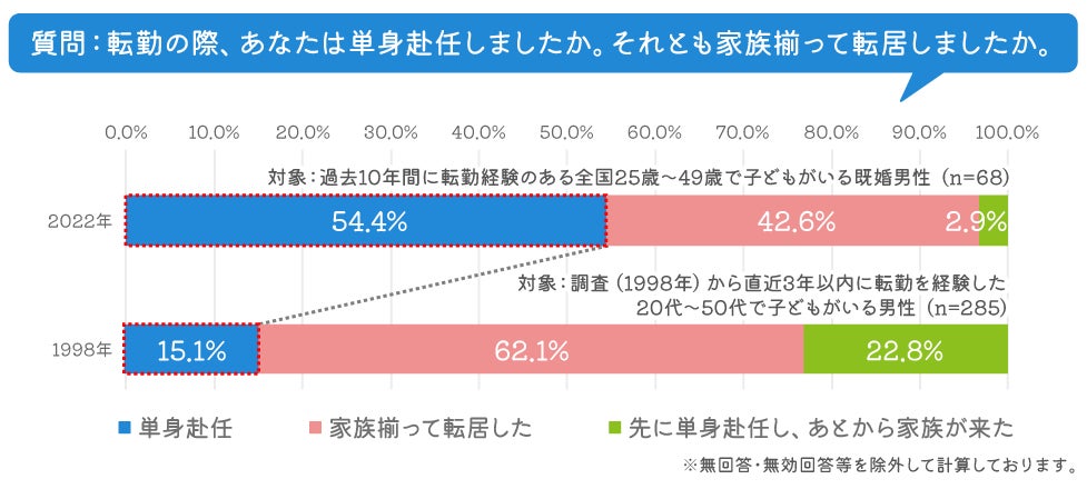 1998年調査の、20代~50代男性の回答では、転勤時の単身赴任比率は15.1%に対し、2022年調査の男性の回答では54 .4%と、その差は歴然としています。20年以上前は「転勤=家族で引越をすること」が当然の時代だったのかもしれません。