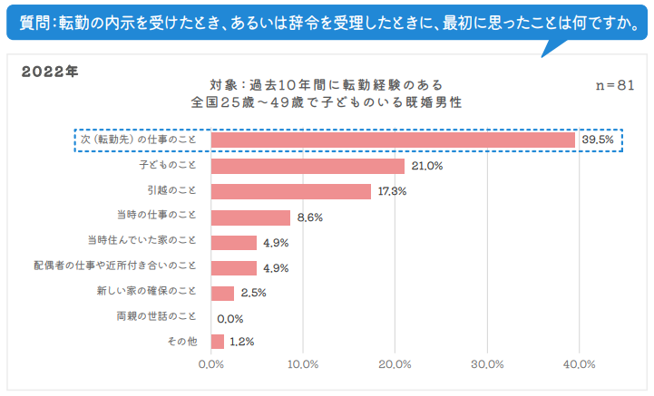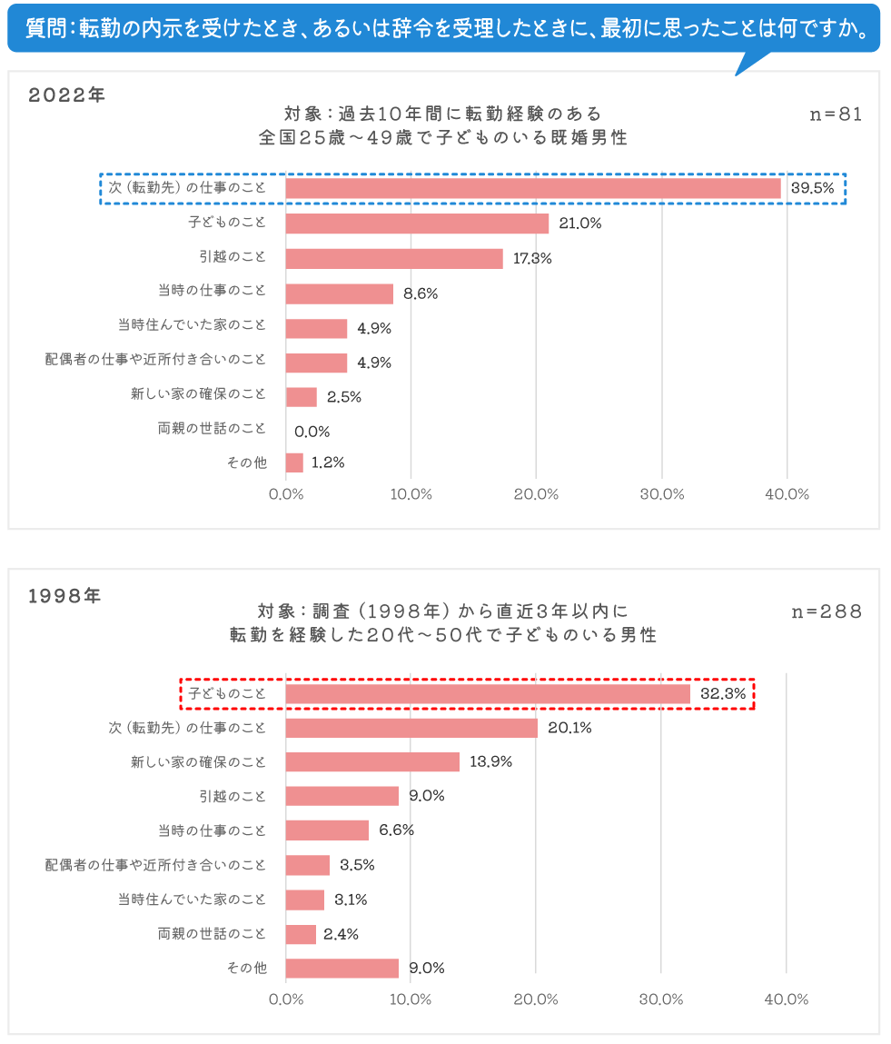 2022年調査では転勤の辞令(内示)を受けて最初に思ったことを25歳~ 49歳の子供のいる既婚男性に聞くと第1位は 「次(転勤先)の仕事のこと」 となり、1998年調査時点での第1位だった「子どものこと」は第2位に。