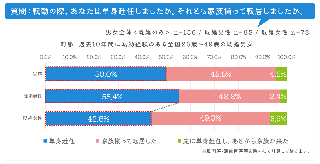 転勤の際、家族揃って転居したか、単身赴任をしたかを聞いたところ、既婚の男女全体では半数が単身赴任を選んだと回答。男女別で見ると、男性は55.4%、女性は43.8%と男性の方が11.6ポイント高くなりました。やはり、既婚女性の方 は、単身で転勤することに対して、男性と比べてまだハードルが高いのではと想定されます。 既婚者全体では「家族揃って転居した」(45.5%)、「先に単身赴任し、あとから家族が来た」(4.5%)と家族で転勤した人は合わせて50.0%と単身赴任を選択した人と同数。今は単身赴任も当たり前なのかもしれません。
