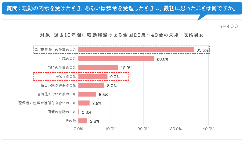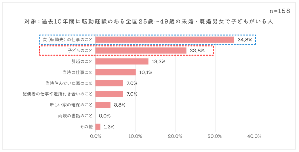 一方で、子どもがいる人に絞って結果を見ると、第1位は変わらず「次(転勤先)の仕事のこと」(34 .8%)でしたが、第2位に「子どものこと」(22.8%)が入り、やはり転勤において、仕事のことはもちろん、子どものことを考える傾向が読み取れました。