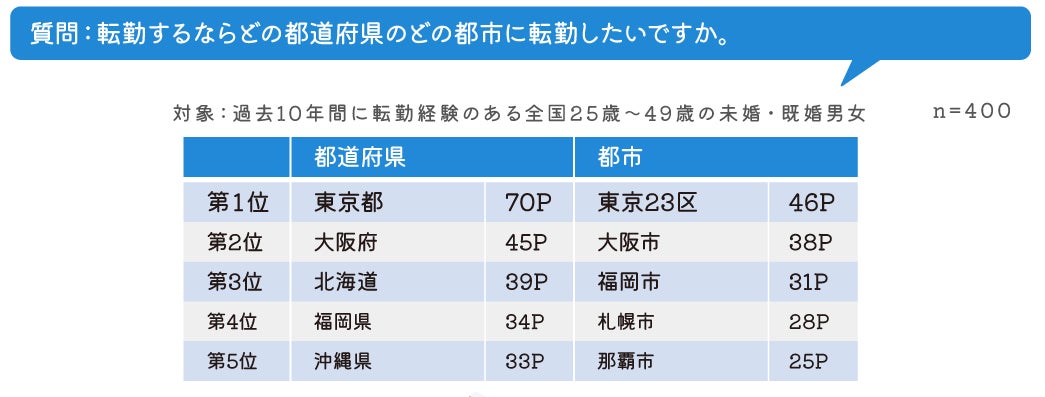 今後もし転勤するならば、どの都市に行ってみたいかを聞いてみたところ、都道府県単位では第1位に「東京都」、 第2位は「大阪府」となり、さらに都市ごとの回答でも第1位は「東京23区」、第2位に「大阪市」となり、仕事をする 上でも、生活する上でも利便性の高い大都市に人気が集まりました。 また、都道府県単位での第3位は「北海道」、第4位に「福岡県」、第5位は「沖縄県」となり、観光地としての人気の 高い地域が続き、せっかく転勤するならプライベートでも楽しめそうな場所に行きたいと考える人が多いと思われます。