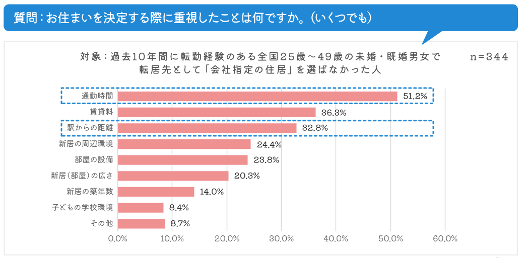 | 転居先を決定する際に重視したことは、「通勤時間」「賃貸料」「駅からの距離」 |