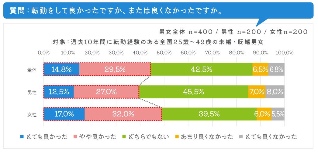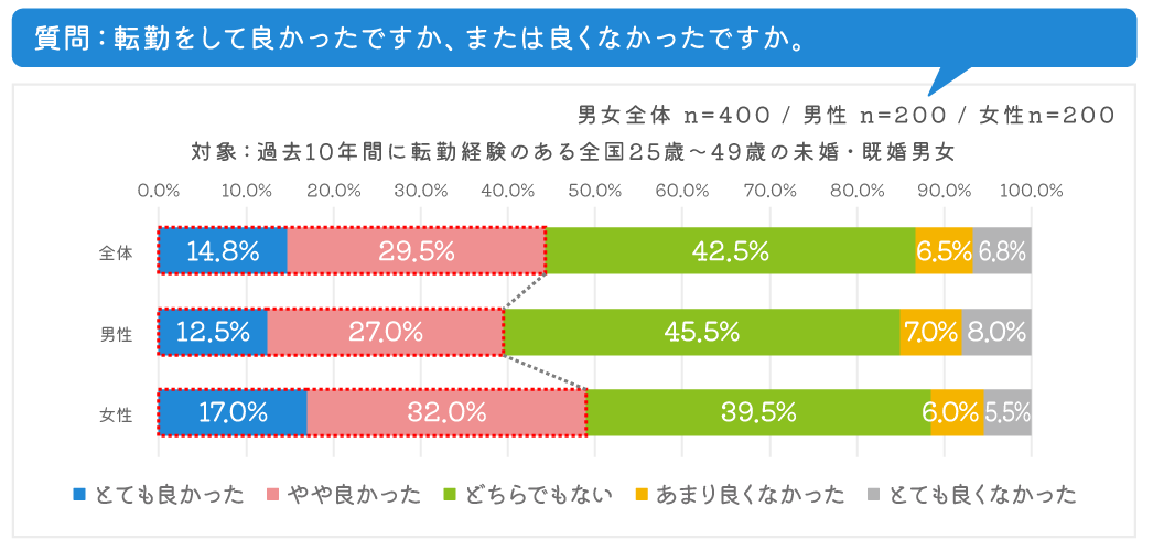 転勤経験の感想を聞いたところ、「とても良かった」「やや良かった」を選んだ人(計4 4 .3%)に対し、「あまり良くなかった」「とても良くなかった」を選んだ人(計13.3%)が大きく下回りました。また男女別で比較したところ、 「とても良かった」「やや良かった」を選んだ人は、女性(計49.0%)が男性(計39.5%)より約10ポイント高く、 女性の方がより転勤をポジティブに捉えていることがわかりました。