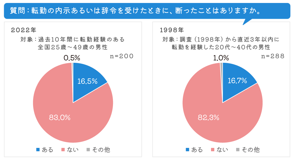 転勤辞令( 内示 )を断った経 験のある人は1998年で16 .7 %と 、2022年と大きな違いはない