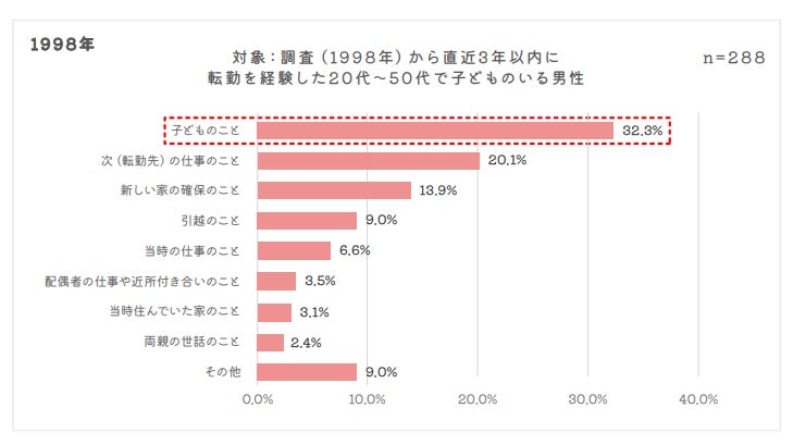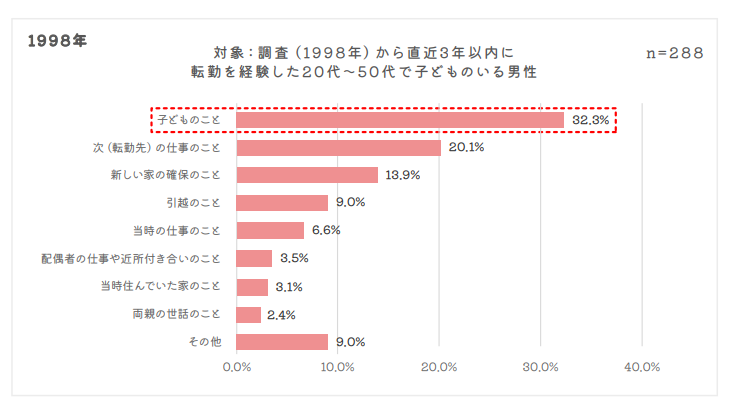 多くの人が単身赴任を前提とした転勤を考えるようになったため、子どものいる既婚男性を比べても自身の仕事の ことを最初に考えた人が多くなったと思われます。1998年当時は転勤する際に家族で引越をするという意識が強く、当時とは思ったことも大きく変わったことが読み取れます。