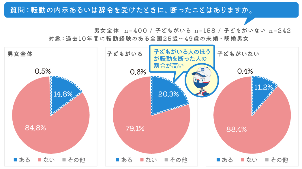 転勤の辞令(内示)を断った経験がある人は男女全体で14.8%、転勤の辞令(内示)を断った人も一定数いることが改めてわかりました。また、この質問において、子どもがいる・いないで比較すると、子どもがいる人で転勤を断った 経験がある人は20.3%、子どもがいない人で転勤を断った経験がある人は11.2%と約9ポイントの差があり、子ども がいる・いないが転勤を受け入れるかどうかの要因の一つになっていることが推察されます。