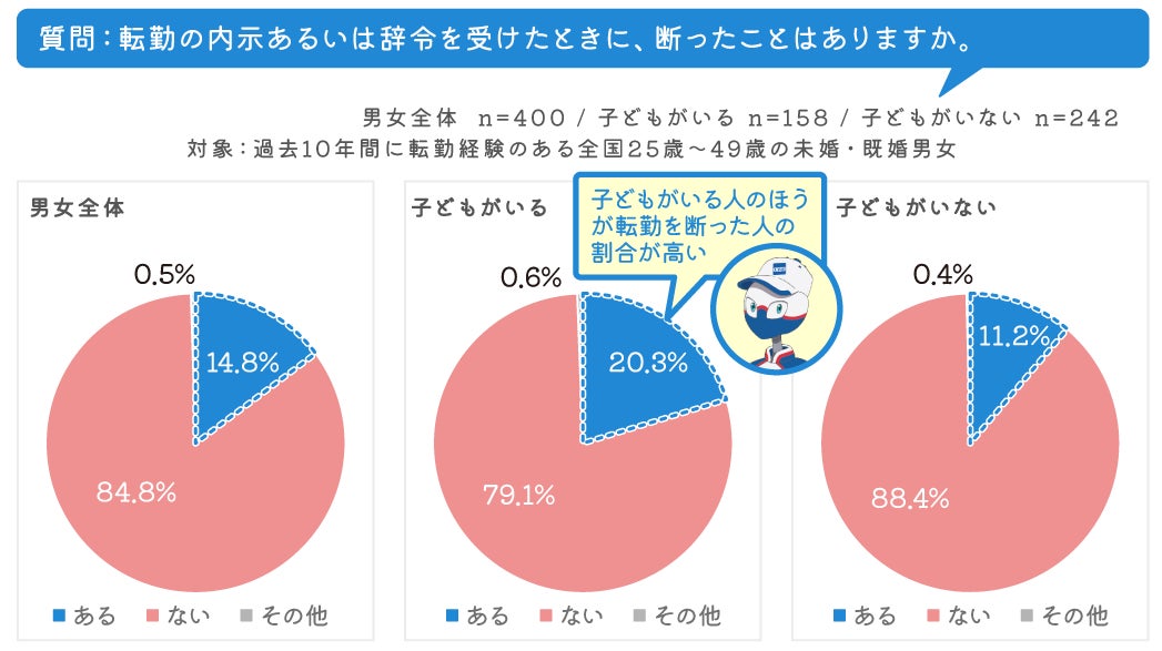 | 転勤の辞令(内示)を断った経験がある人は14 .8%、 さらに、子どもがいる人だと20.3%が転勤を断った経験あり |