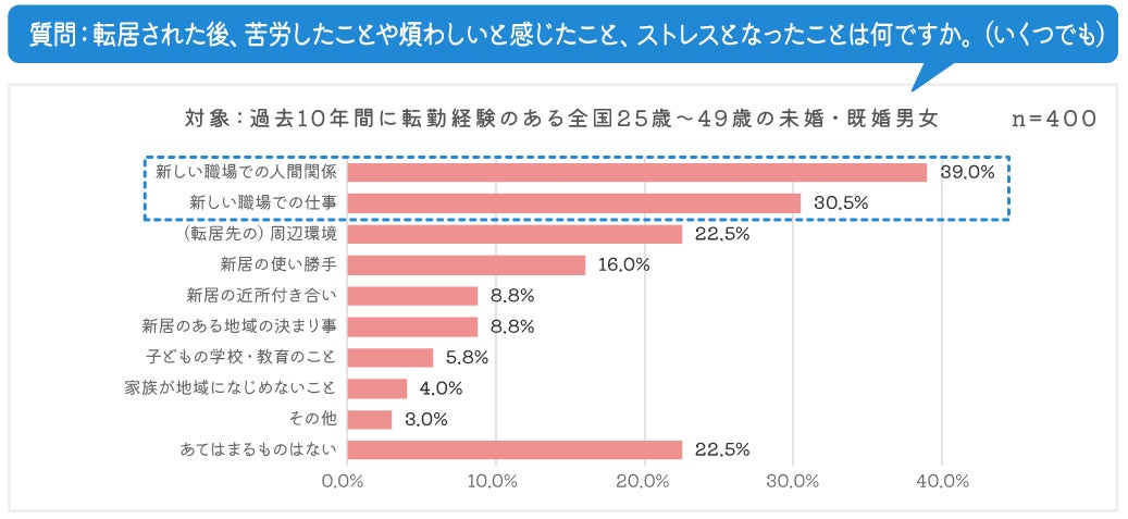 ●転勤後の苦労や悩み、第1位は「新しい職場での人間関係」、第2位に「新しい職場での仕事」