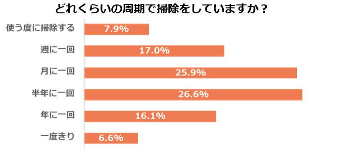 おもちゃの掃除・清掃をしたことがある人に対して、掃除・清掃の頻度について聞いたところ、「半年に1回」と「月に1回」が共に25.6%となりました。それ以上の頻度である「週に1回」は17.4%、「使う度に掃除・清掃する」は8.1%にとどまり、月に1回以下の回答が7割超を超える結果となりました。