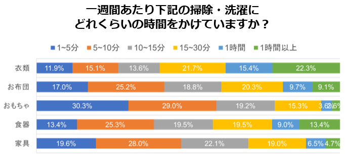 また、おもちゃの掃除・清掃にかける時間は「1~5分」(30.3%)、「5~10分」(29.0%)が多く、10分未満とする回答で6割近くを占めることになりました。衣類、お布団、食器、家具では10分未満とする回答はいずれも半数以下であり、おもちゃの掃除・清掃にかける時間は相対的にみて短いことが分かりました。