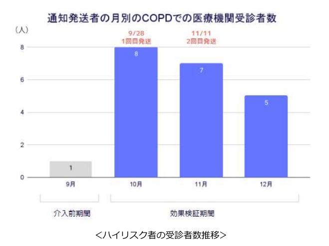 特に、ハイリスク者の場合、2022年9月の受診者数は1人であったことに対し、通知送付後の10月は8人に増加する結果が得られました。