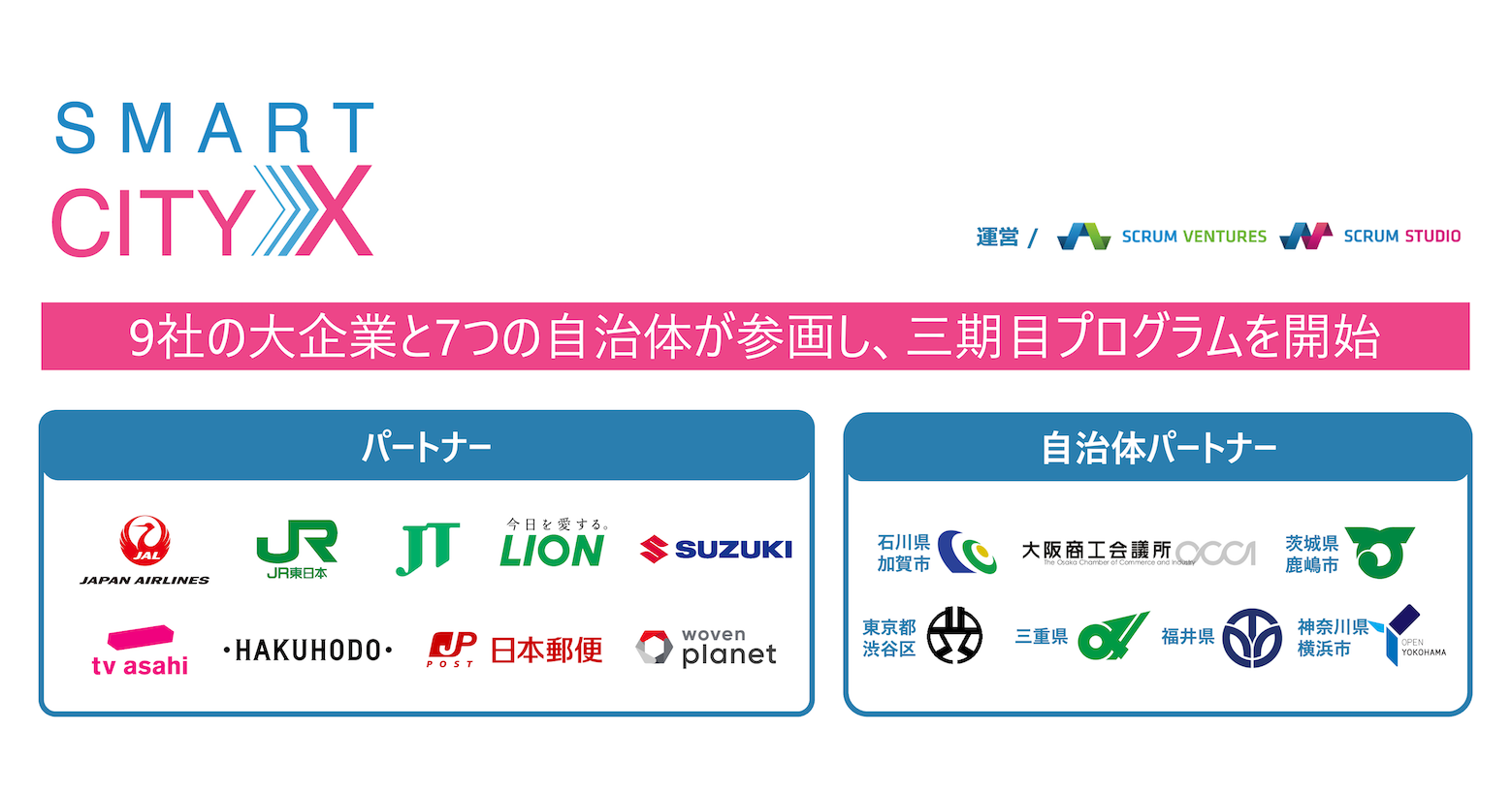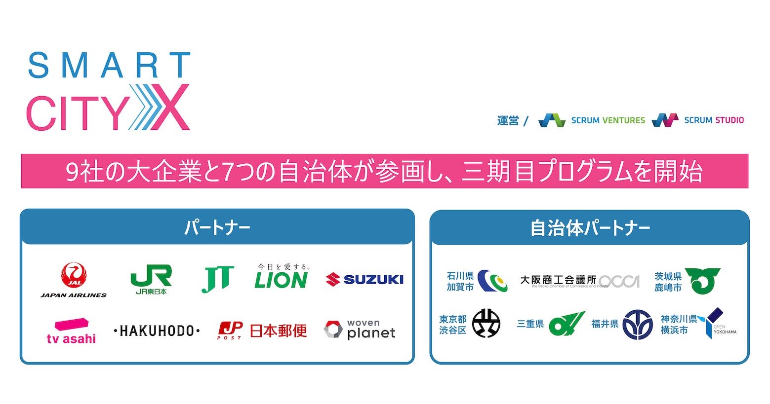 スクラムスタジオ株式会社(本社:東京都港区、代表取締役社長:髙橋正巳)は、国内の各産業を代表する大企業とともに、世界中のスタートアップと連携し、事業共創を行うグローバル・オープンイノベーション・プログラム『SmartCityX』の三期目を開始します。パートナー企業に株式会社テレビ朝日が新たに加わり、計9社の大企業、7つの自治体が参画した形でスタートします。