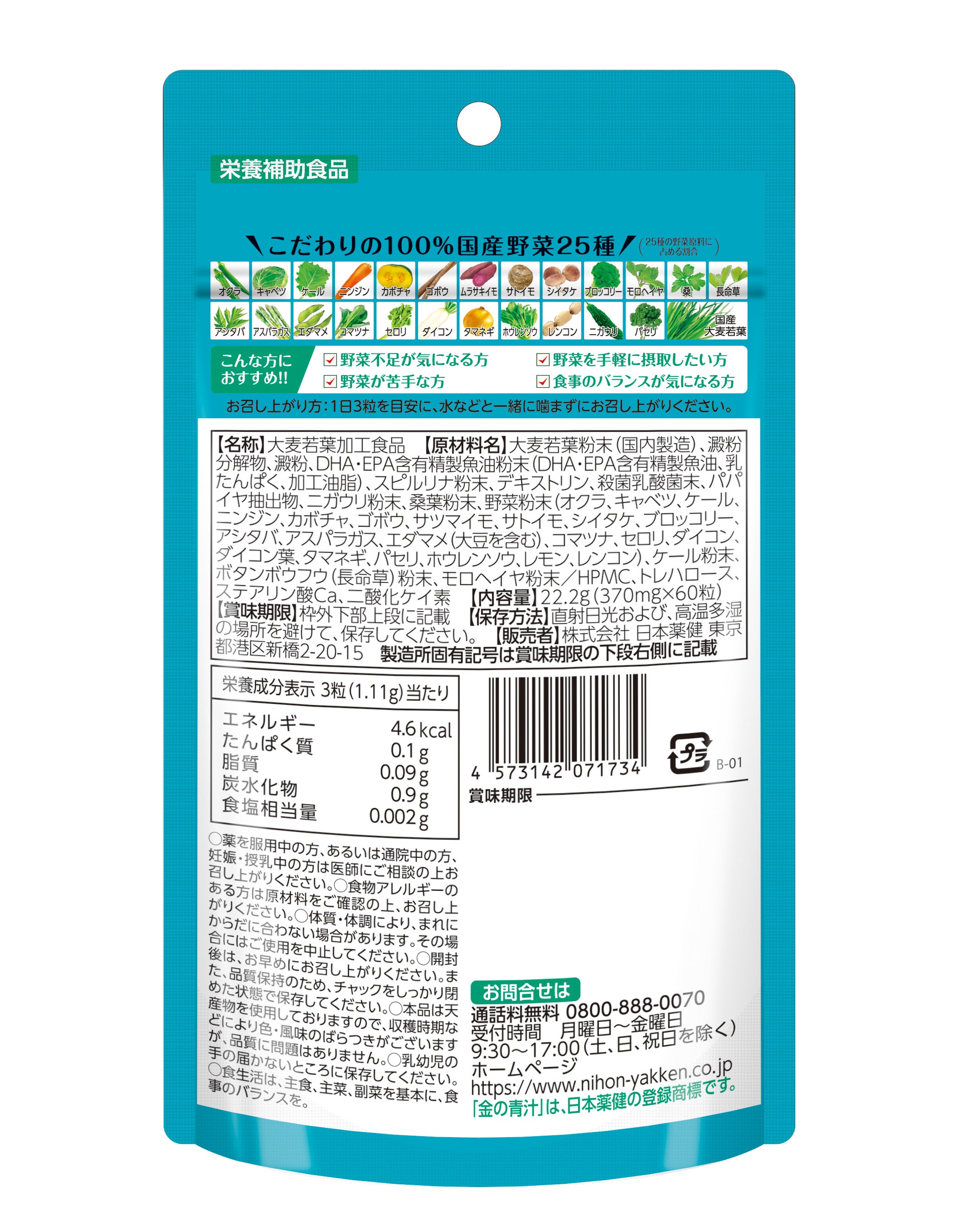 野菜や、健康と美をサポートする乳酸菌・酵素だけでなく、青魚に多く含まれるDHA・EPAを配合し、野菜不足と魚不足をまとめてチャージすることが出来ます。
