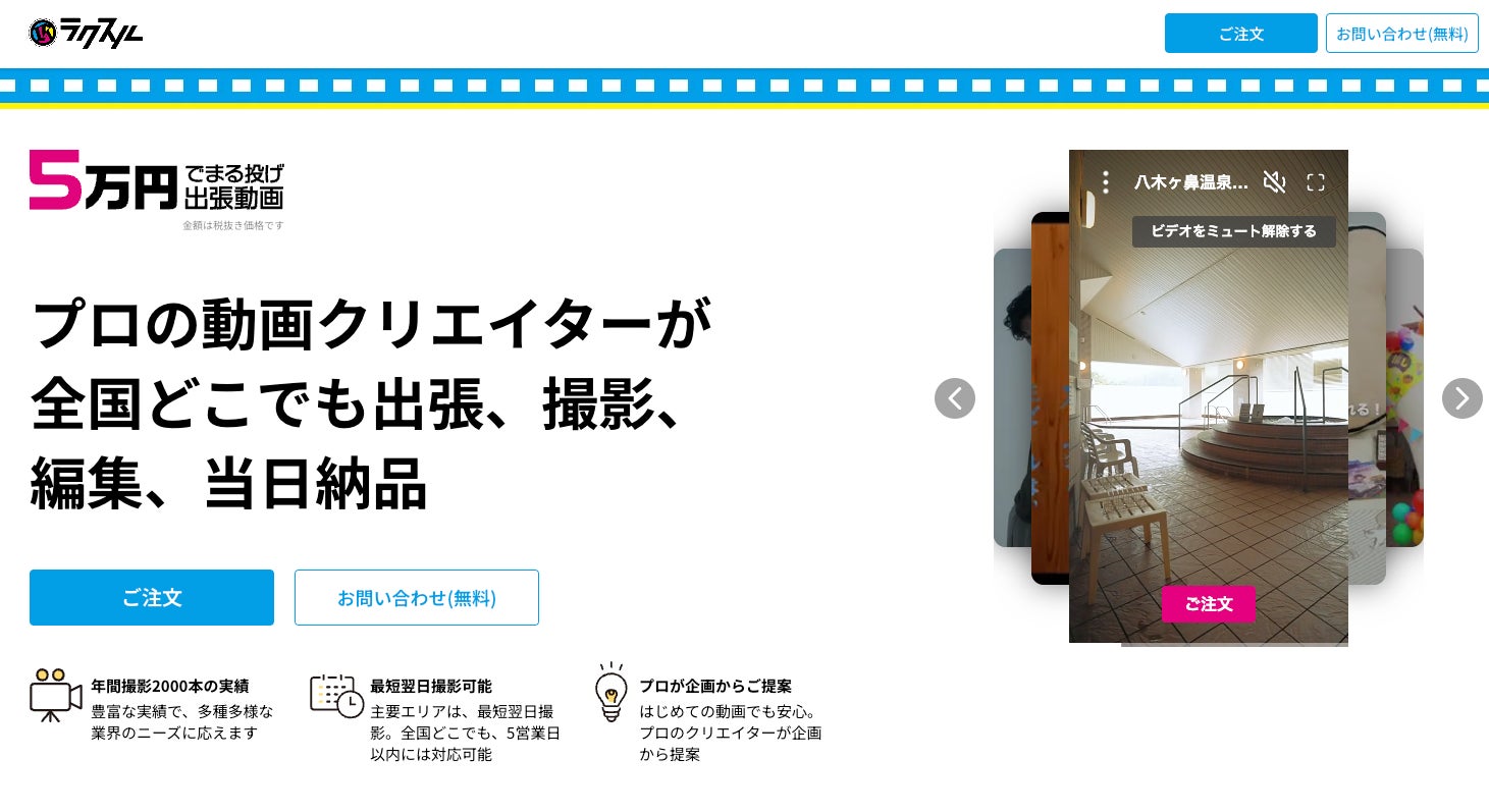 ラクスルが展開する「5万円でまる投げ出張動画」は、5万円でプロの撮影から編集までを依頼でき、短期間で完成できることが大きな特長です。