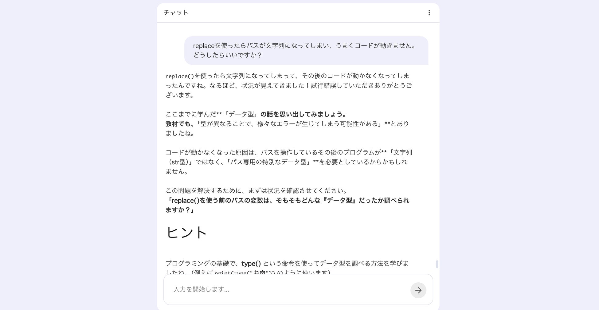 プログラミング学習中のエラーや疑問点による停滞は、挫折を招く要因にもなります。そこで本講座では、Googleの生成AI「NotebookLM」を学習補助ツールに採用し、生徒がエラーに直面した際の心強い伴走体制を整えました。