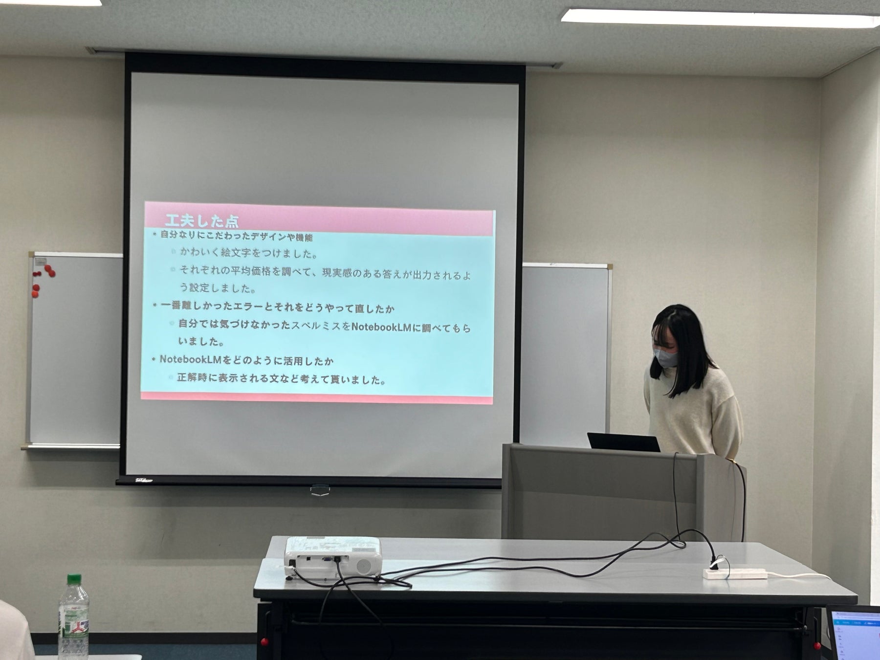 また、最終日の「成果発表会」では教材の枠を超え、新機能を実装したオリジナル作品を披露しました。生成AIを活用しながら自分で考えて実装するプロセスを通じて、プログラムの深い理解とスキルの定着が実現しました。一人ひとり堂々とプレゼンテーションを行う様子は、生徒たちの大きな自己肯定感と達成感へとつながりました。