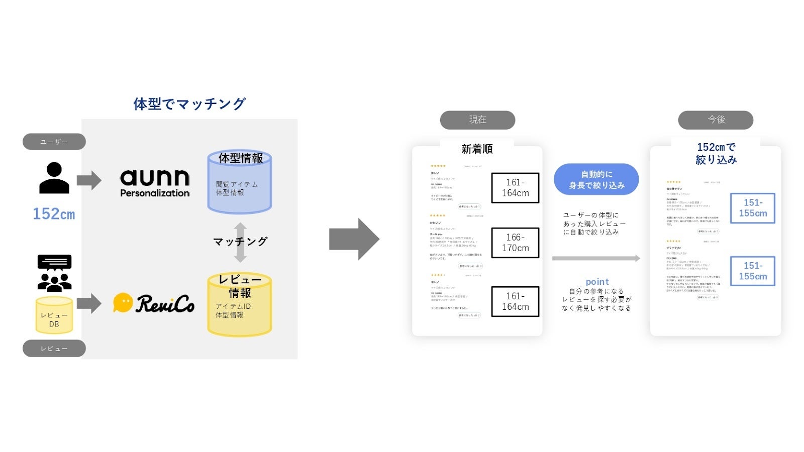 ユーザーの体型や好みを基に、コンテンツをパーソナライズする「aunn Personalization」と、レビューマーケティングプラットフォーム「ReviCo」が連携し、レビューをパーソナライズすることで、ユーザーの購買体験を向上させるため以下の取り組みを実施します。これにより、ユーザーは自分の体型と近い購入者のレビューを探すことなく閲覧することが可能となり、購入の手助けになることが期待できます。