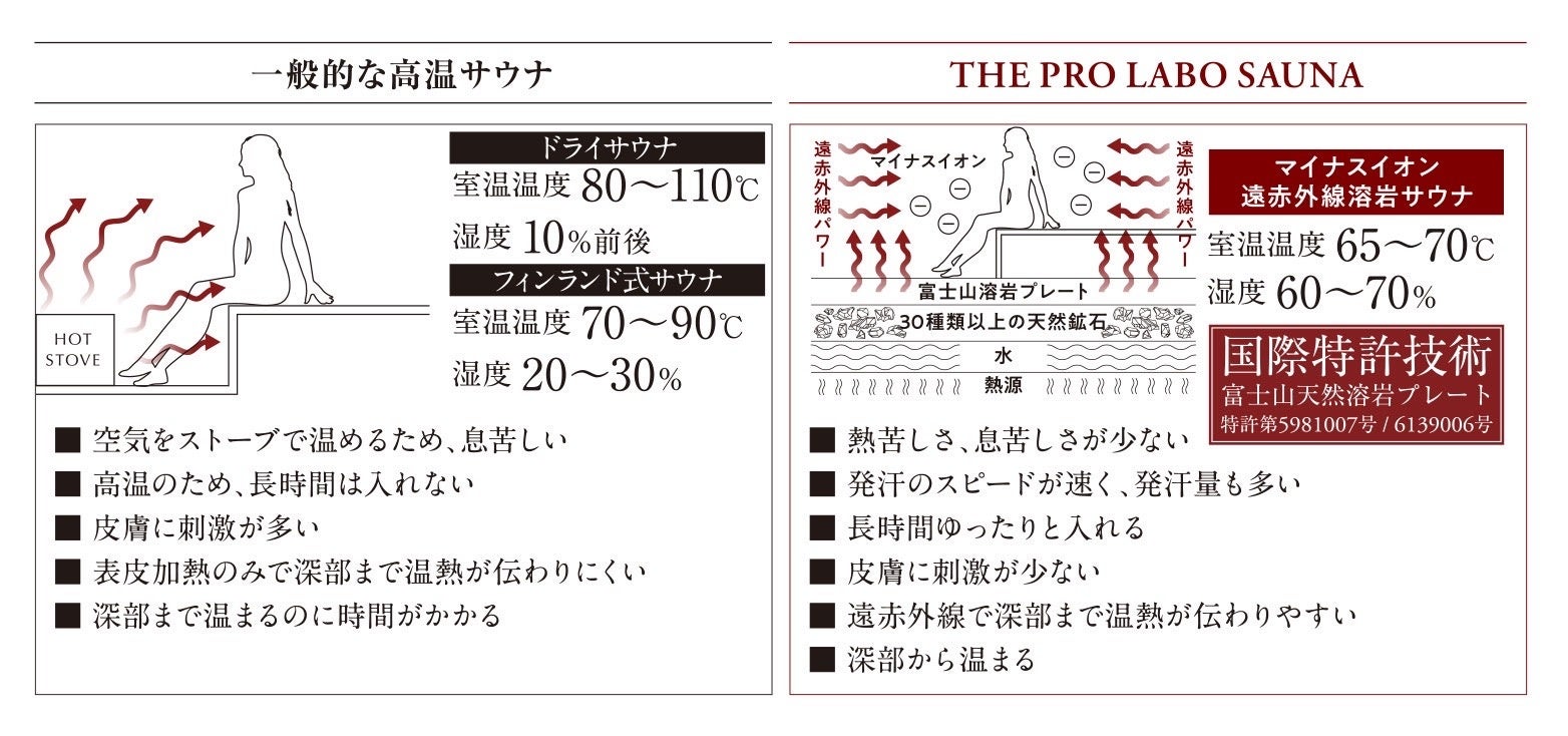 当施設は、通常のサウナのような息苦しさはなく、国際特許技術の富士山溶岩(マグマ)プレートの遠赤外線による独自の温め技術で『深部体温+1℃』を実現し、汗をかきにくい方でも驚くほどの発汗を実感いただくことができます。
