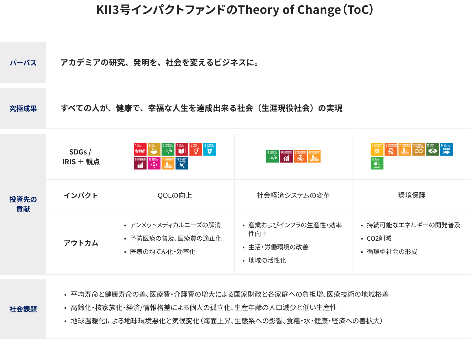 2023年10月には、大学VC初のインパクトファンド「KII3号インパクトファンド」を設立し、「すべての人が、健康で、幸福な人生を達成出来る社会(生涯現役社会)の実現」を目指すと同時に、アカデミア発スタートアップにインパクト投資を行うことにより、金銭的なリターンと並行して、ポジティブで測定可能な社会的・環境的インパクトの創出を目指します。