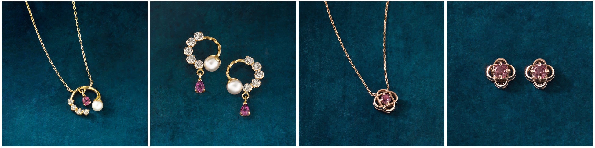 霧のかかった幻想的なお花畑をイメージした『Misty Flora』は有機的な植物を感じさせるサークルと艶めくパールが華やかなデザイン。さり気なく揺れるロードライトガーネットの輝きがアクセントに。 ローズカラーが美しい『Kalanchoe』は、「幸福を告げる」「貴方を守る」という花言葉がある12月の誕生花カランコエをイメージ。グラフィカルなシルエットに透かしを入れる事で、抜け感が魅力的なデザインに。