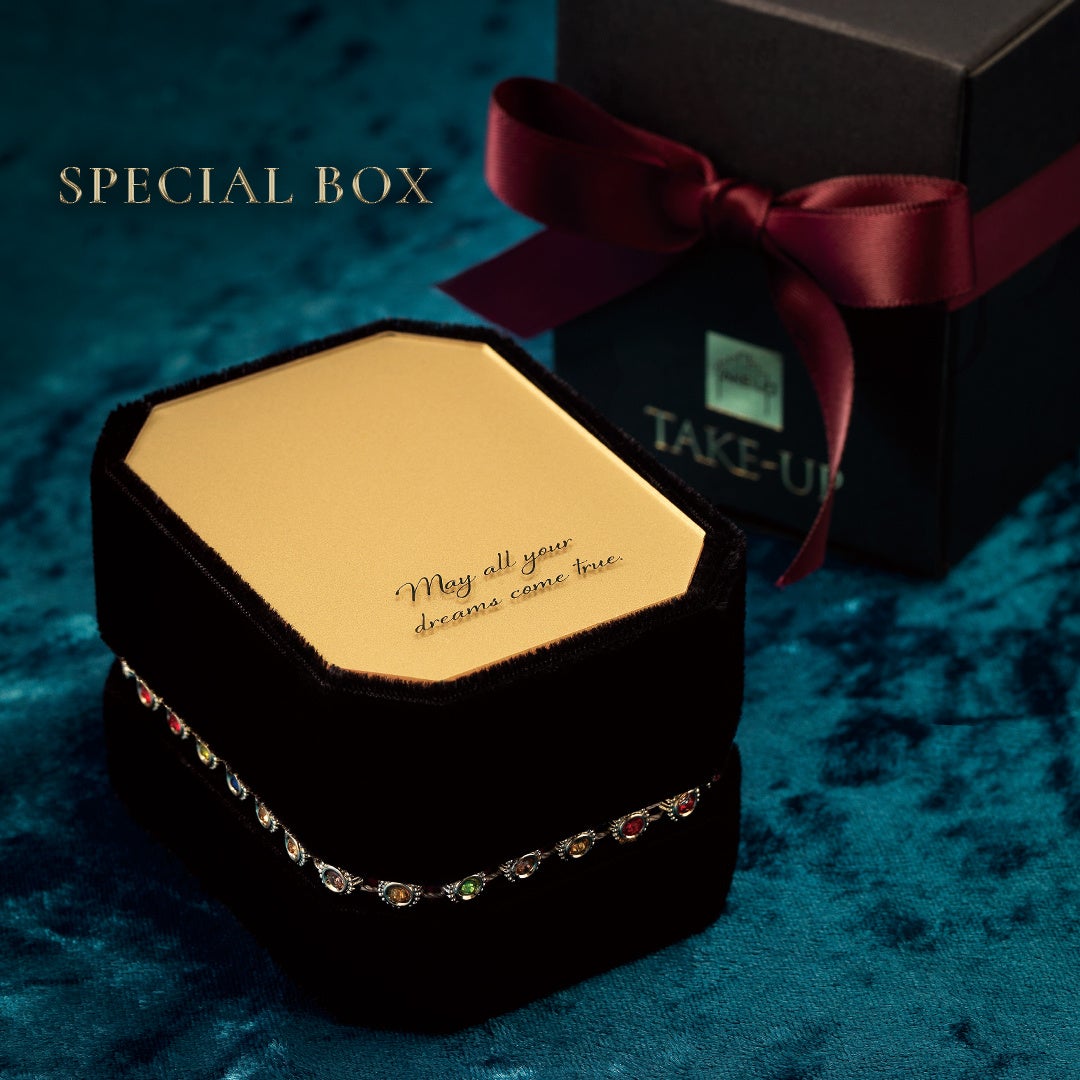 DREAMYの世界観を表現したゴールドとブラックの大人なカラー配色と、カラフルなビジューのストーンがお洒落な印象の特別感溢れるボックスです。