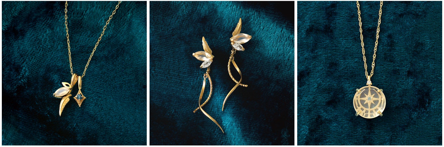 「幸運の訪れ」や「平和」を象徴する白鳩をイメージした『Flutter』。大きく羽根を羽ばたかせる様子を表現したパーツは、ムーンストーンの柔らかく奥行きのある表情が魅力的。「星をつかむもの」という意味の『Astrolabe』をモチーフにしたネックレスは、アストロラーベと星と重ね合わせたコイン型のトップが特徴。柔らかなトーンのミルキークォーツは、様々なコーディネートに合わせて幅広くお楽しみ頂けます。