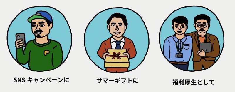これまでの利用例としては、「SNSキャンペーン景品」、「自社アプリのアンバサダーへの成果報酬ギフト」、「顧客へのサマーギフト」、「福利厚生やイベント景品として使う社内向けギフト」など様々な利用シーンでご活用いただいています。