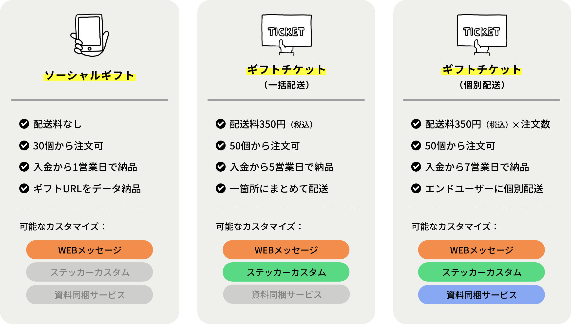 利用できるテーマ(ギフト)は個人向けと同じですが、SNS等で贈る場合のWEBメッセージカードデザインや、ギフトチケットで贈る場合のステッカーのカスタマイズ等も対応できるため※、各法人様のロゴマークのご活用などでオリジナリティを演出することも可能です。