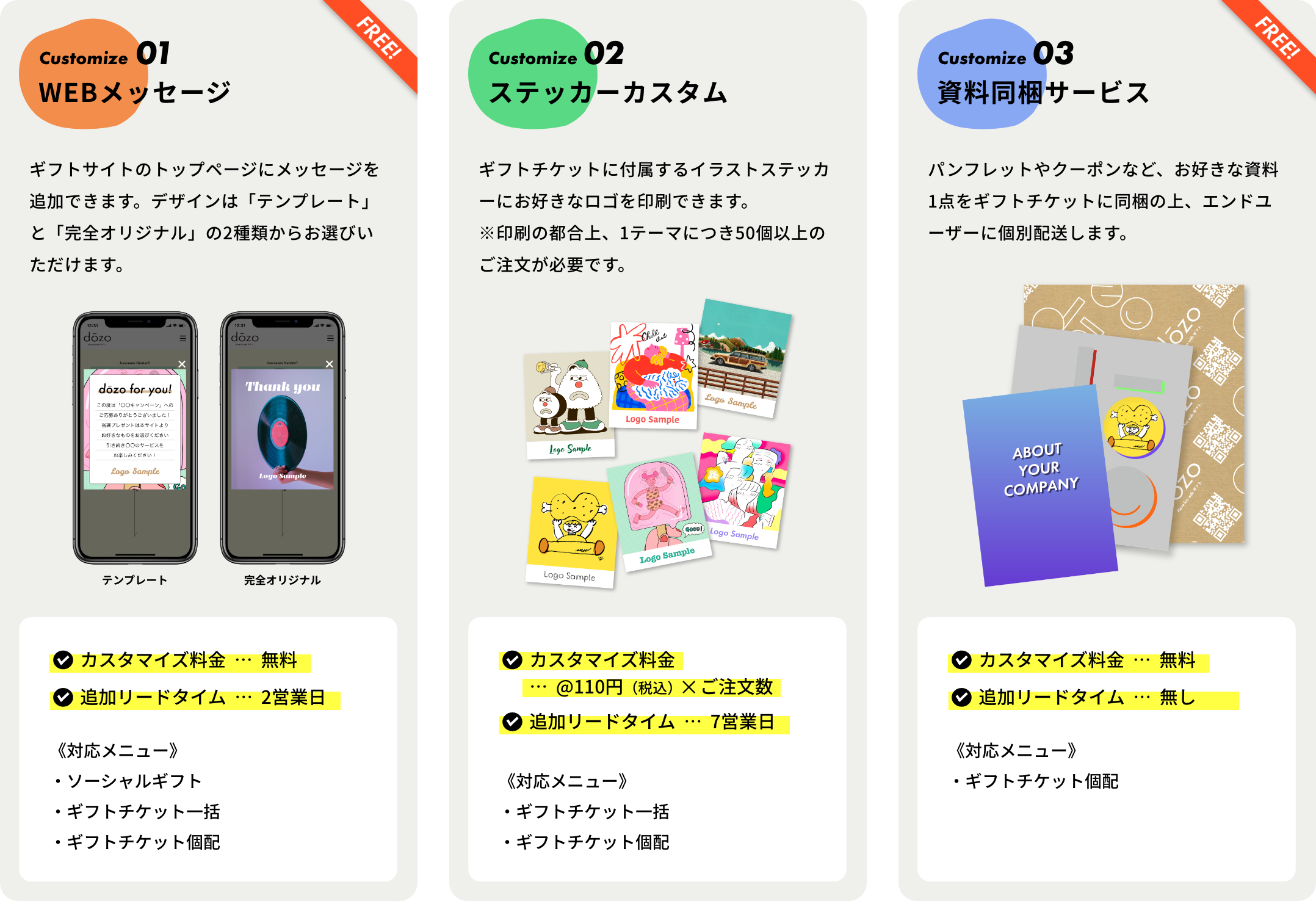 ・イラストステッカー(ギフトチケット付属)へのロゴ入れカスタマイズが可能(有料)