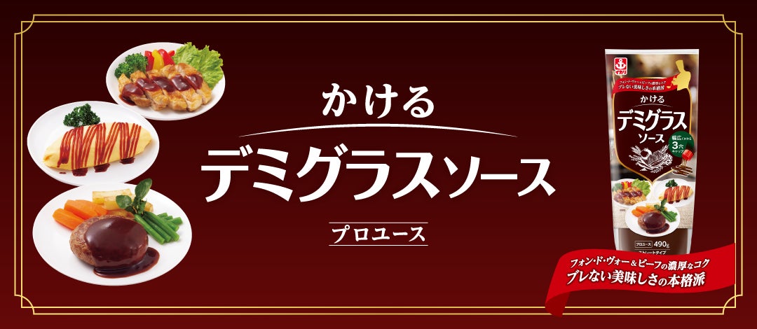 ※1:イカリソース(株)はチューブ型お好み焼ソースなどを製造していたノウハウを生かし、2000年にチューブ型の家庭用商品『かけるデミグラスソース290』を発売しました。当時、家庭用デミグラスソースは缶入りが主流で加熱調理して使うのが一般的であったため本商品は画期的でした。発売から23年が経った現在もご愛顧いただいている商品です。
