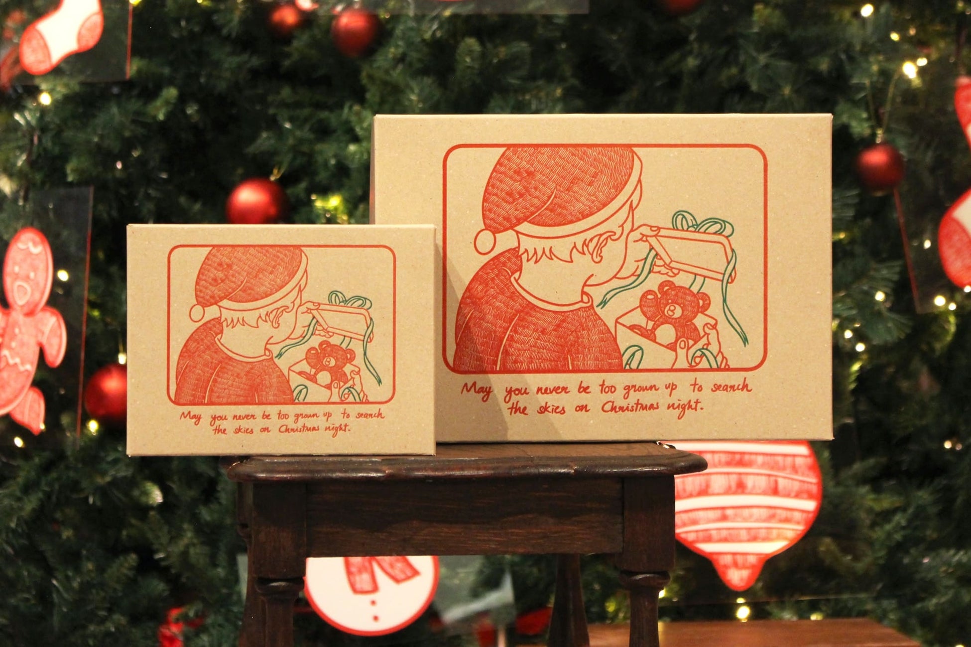 "May you never be too grown up to search the skies on Christmas night.(大人になっても、クリスマスの夜に空を探していた頃の気持ちを失わないように)"というメッセージが刻まれたボックスです。