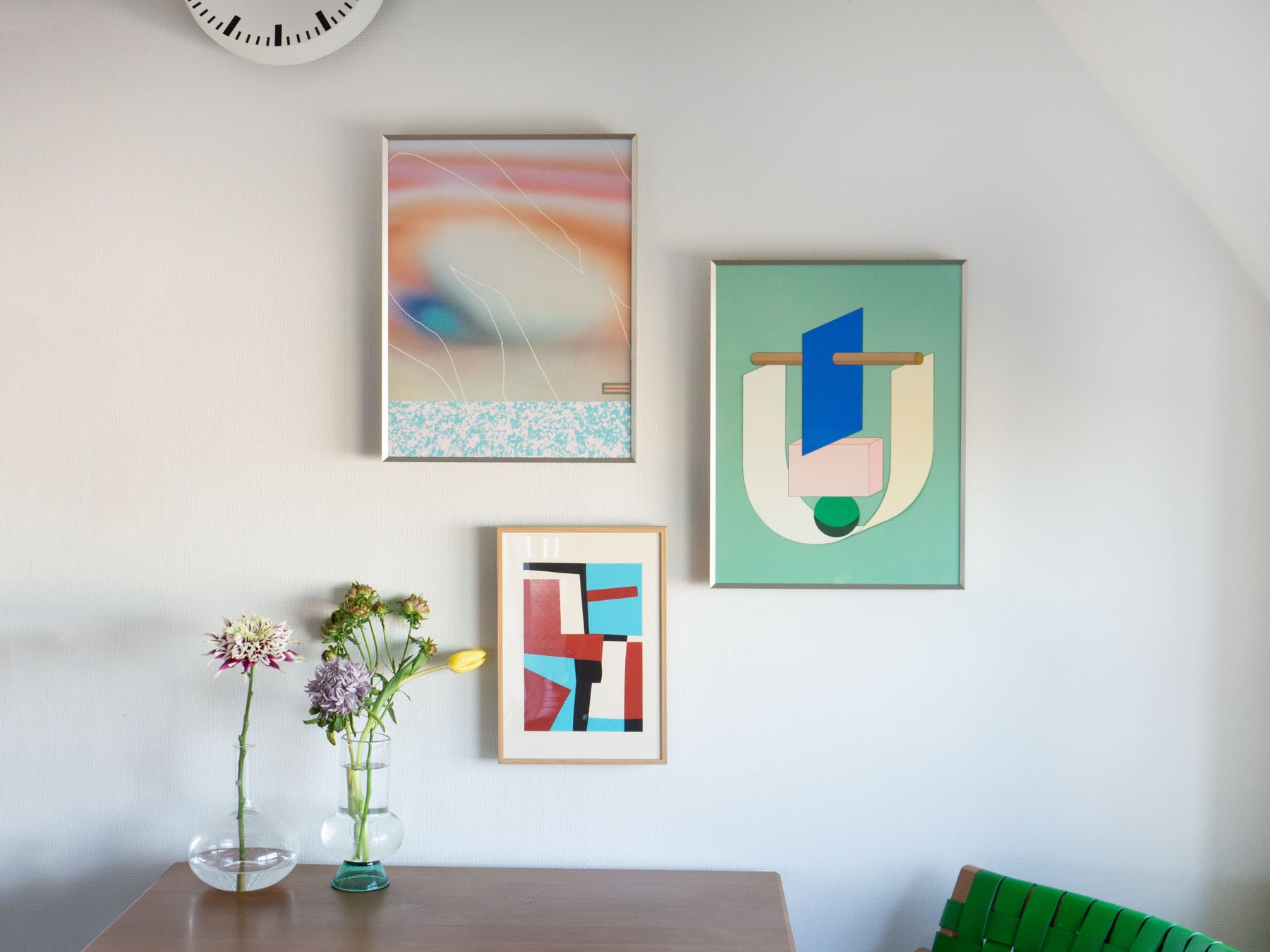 会場では、ご自宅などで飾った様子がイメージしやすいように、家具と共に作品をご覧頂けます。色の重なりや質感が再現されたプリント作品を、この機会に是非ご覧ください。