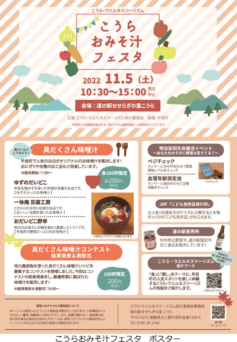 また同道の駅にて2022年11月5日(土)に開催する食に関するイベント「こうらおみそ汁フェスタ」では、第一弾の『甲良黒豆PALE ALE』を始めとするオリジナル加工食品や、具だくさん味噌汁、旬の地元食材を購入できます。