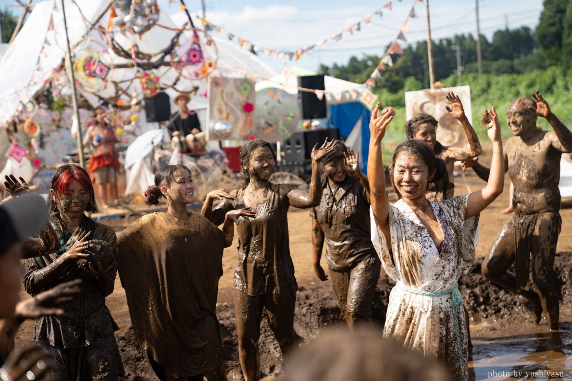 ふかふかとドロドロ2つの感触を選べる畑のダンスフロアでは、トライバルなパーカッションバンドやDJの音楽で身体を揺らし、有機野菜をその場で収穫してそのままいただくことができます。その他にも地域の名産品が並ぶマルシェや、農家さんとのトークライブ、泥ヨガ、泥ーイング、泥スライダー等々、五感全体を使って地球を感じる1日になります。