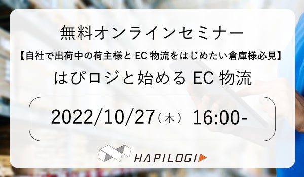 流通インフラプラットフォームサービスを展開する株式会社はぴロジ(所在地:東京都港区虎ノ門、代表取締役社長:木村 和弘、URL:https://www.hapilogi.co.jp、以下「はぴロジ」)は、2022年10月27日(木)16:00〜に『はぴロジと始めるEC物流』と題した無料オンラインセミナーを開催いたします。