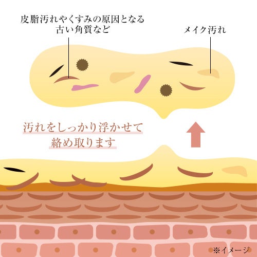 “汚れをしっかり浮かせるオイル”と“汚れをからめて取り除くオイル”を組み合わせた「クリアオフオイル」配合で、くすみの原因となる毛穴汚れやメイク汚れ、古い角質をしっかりオフ。