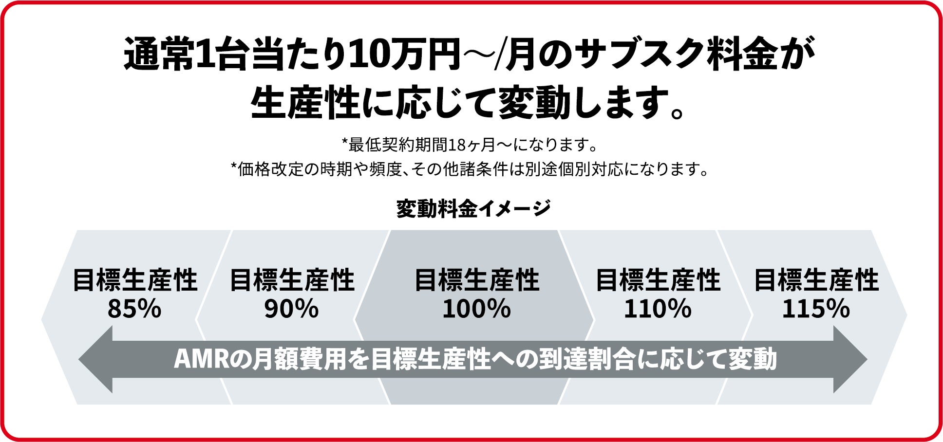 本プログラムは、AMR導入後の生産性に応じて月額のサブスクリプション費用が変わる、成果連動型の料金体系を採用しております。AMR導入後に、期待した生産性を達成できなかった場合でも、支払金額が生産性に応じて下がることから費用対効果を担保しやすくなります。これにより、倉庫の自動化・省人化の為にAMRに興味があっても、十分な費用対効果を創出できるか確信が持てないお客様や、投資が失敗した場合のリスクを懸念し導入に踏み切ることができないお客様への導入障壁を下げることが出来ると考えています。